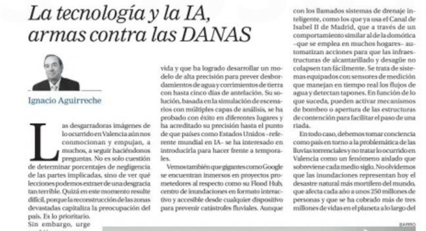 Muy agradecidos al diario La Razón por compartir con sus lectores a página completa un artículo de nuestro CEO Ignacio Aguirreche Schaafsma, en el que analiza el importante papel que pueden jugar la tecnología y la IA en el trabajo predictivo frente a fenómenos como las DANAs.
