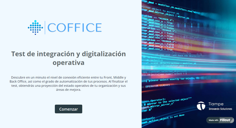 Conscientes de ello, en Tiampe hemos desarrollado una herramienta en forma de test que permite medir en menos de un minuto, y de forma totalmente anónima, el nivel de conexión eficiente entre el Front, Middle y Back Office de una organización, así como el grado de automatización de sus procesos internos.